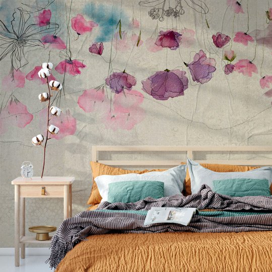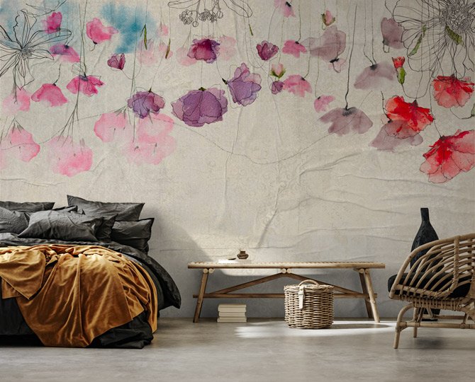 La carta da parati “Ballet des Pétales” è personalizzabile a richiesta in variazione di palette colore, e modificabile in base alle misure della parete e posizione degli arredi.