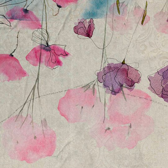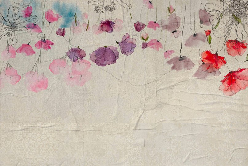 Il tratto a matita, nervoso e leggero, dialoga con le macchie d’acquerello rosa, viola e blu, creando un senso di incompiutezza. Lo sfondo, con la sua texture che ricorda la carta stropicciata, accoglie questa pioggia floreale con morbidezza.