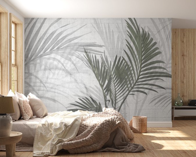 Il disegno resta leggero, mai dominante. Da vicino si percepisce la trama del fondo, da lontano la parete si ricompone in un unico tono, calmo. È una carta che non chiede di essere guardata, ma che si lascia scoprire vivendo lo spazio.