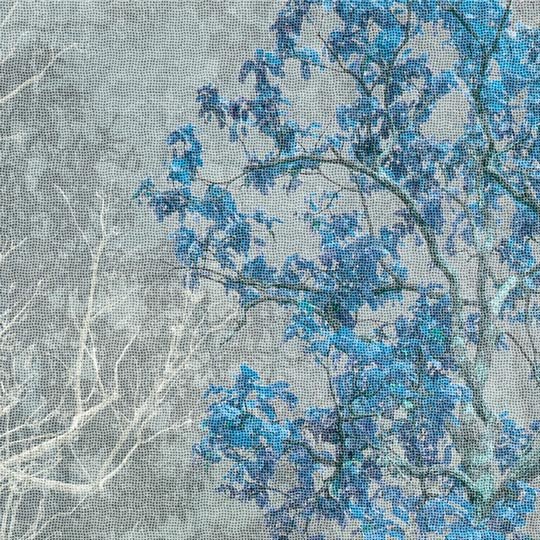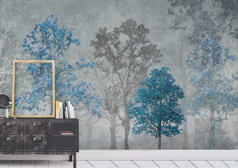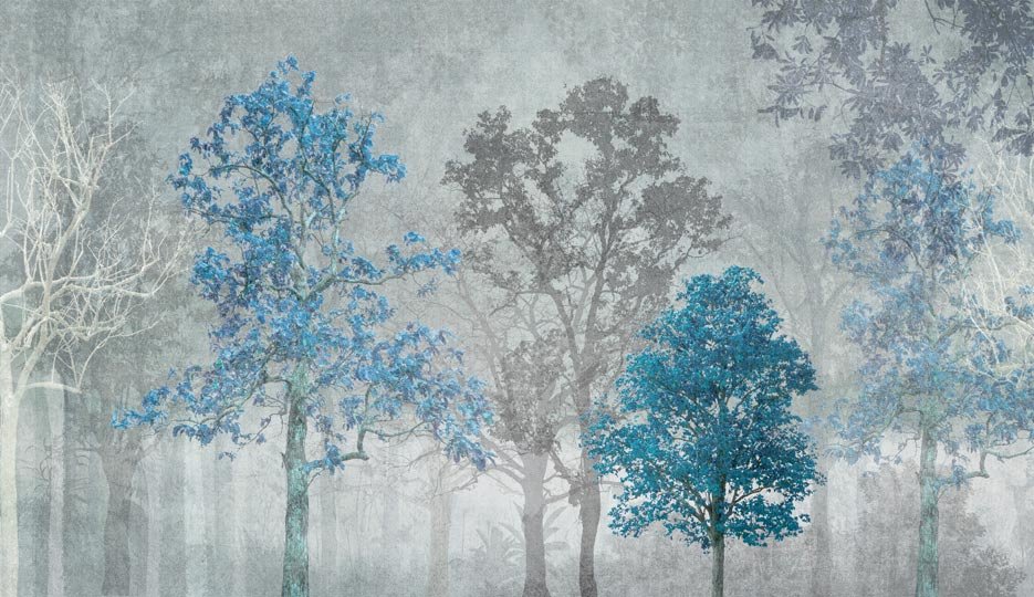 Una suggestiva foresta moderna avvolta da una nebbia dalle tonalità blu. Ideale per ambienti dal gusto contemporaneo e industrial.